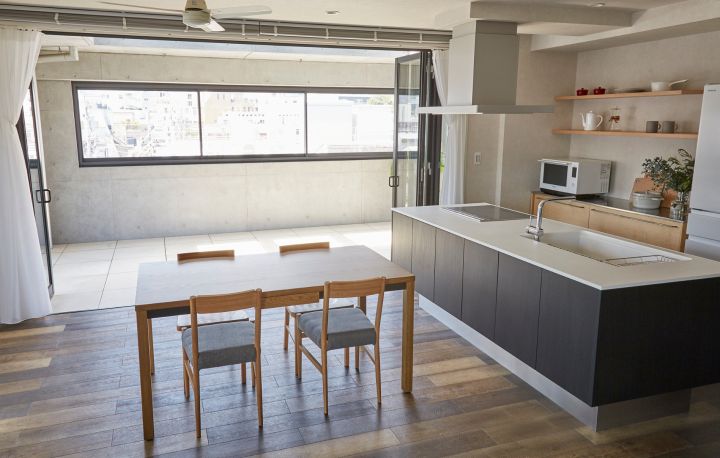 ハウススタジオ。モダンなキッチンとテラス、抜け感ある屋上。