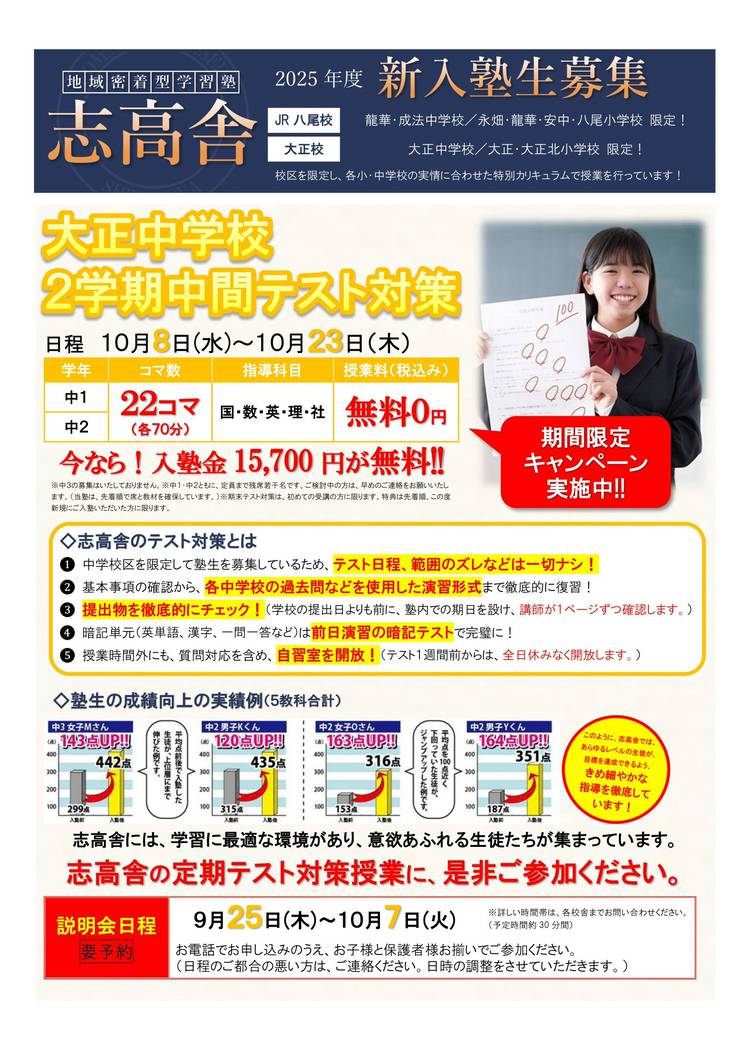 こんにちは!☀️志高舎 大正校です😄 今回は、大正中学校 1年生・2年生対象 1学期中間テスト模擬試験ご案内です✏️ 1年生は中学校に入学して初めての定期テスト、 2年生は学年が上がってから初めての定期テスト、 を1か月後に控え、緊張、様々な不安がありませんか?😥 自信を持って試験に臨めるよう、模擬試験を通じて、今の実力、苦手分野を明確に把握し、残りの約1週間を計画的にテスト対策に充てまし...