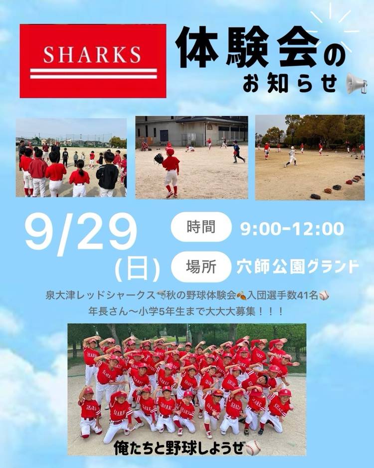 https://instagram.com/p/CpOU7kxBibz/ 泉大津レッドシャークス 春の軟式少年野球体験会のお知らせ🙌 . . 3月12日(日) 10:00~12:00 泉大津レッドシャークス 軟式少年野球体験会を開催決定✨ . 集合場所は 三十合池グラウンド 泉大津市我孫子99-1 場所が分からない時はお気軽にご連絡くださいm(*_ _)m . 持ち物は 水筒/帽子/スニー...