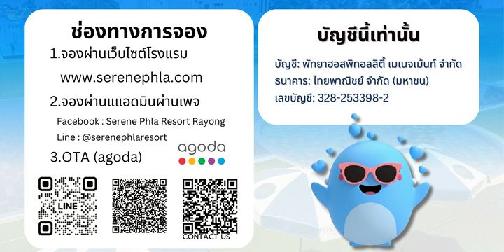 Blue Blue Beach Restaurants Open : 02:00 pm. - 11:00 pm. ลูกค้าสามารถจองโต๊ะได้ที่ Line : @bluebluebeach Tel : 097-6908555 Website : www.serenephla.com หวังอย่างยิ่งว่าจะได้มีโอกาศต้อนรับคุณนะคะ Serene Phla Resort ยินดีให้บริการค่ะ🙏