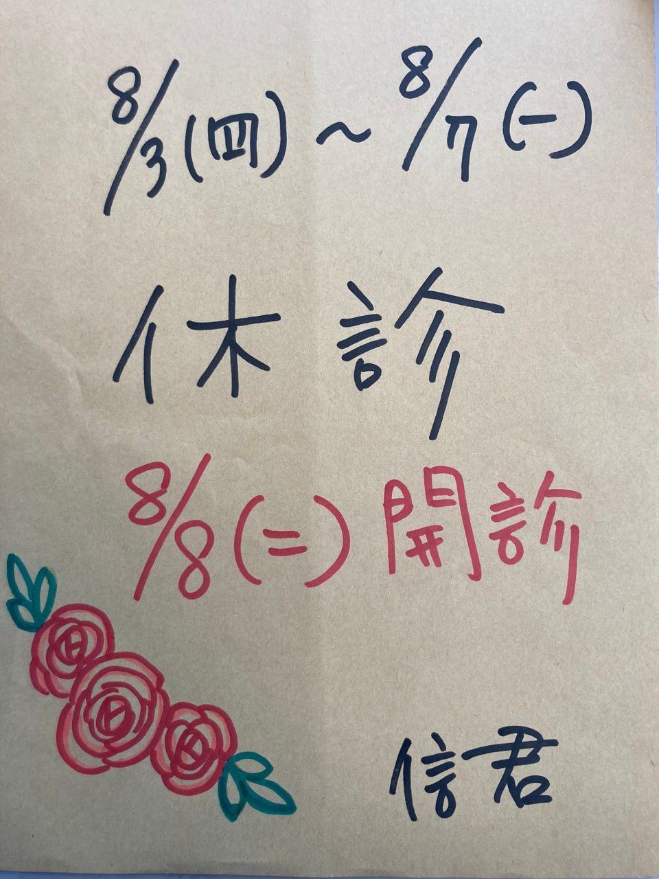 星期六晚上、星期日整天休診。