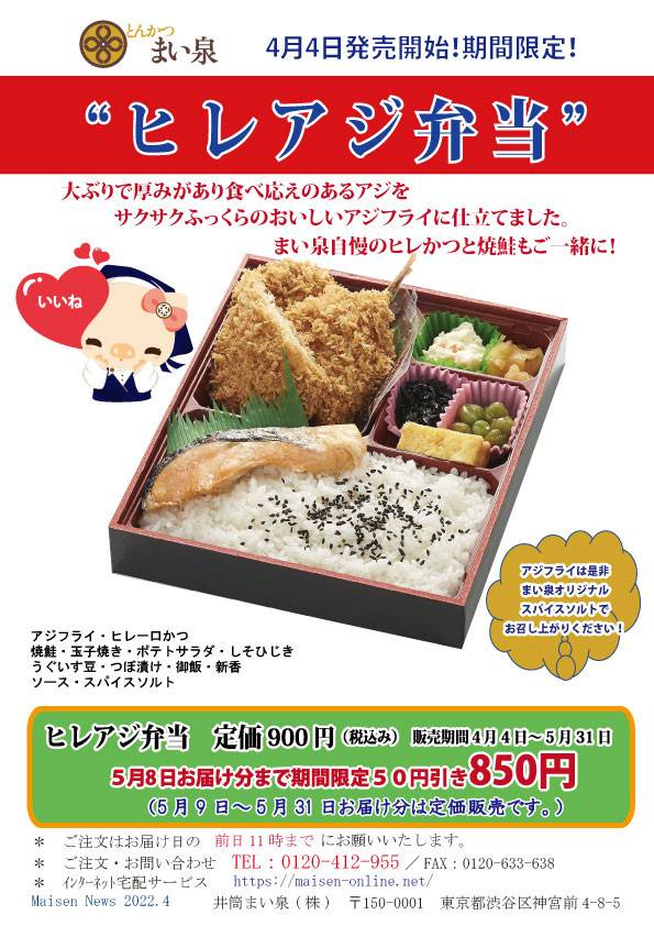4月特別企画弁当のご案内 まい泉の月替わり特別弁当4月編のご案内です 大ぶりでサクサクなアジフライと定番のヒレかつ、焼鮭も入りました大満足のお弁当です 是非ご注文お待ちしております ご注文はこちらから https://maisen-online.net/shopbrand/ct7 お得なクーポンも好評配信中!! クーポン発行はトーク画面のメニューから「クーポン」をタップ...