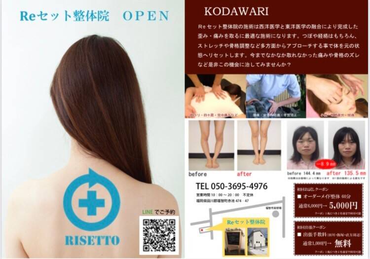 Reセット整体院open 偏頭痛、肩、首痛、腰痛、寝違えその痛みの原因は本当にその部位で合っていますか? 今まで悩んでいた痛みを今リセットしてみませんか? Reセット整体院では自宅サロンはもちろん、出張整体にて施術させていただいております。 みなさんの気になる箇所全てオーダーメイドにて施術をさせていただきます。 小顔矯正、下半身の浮腫みを改善し美脚、O脚矯正、ウエストサイズダウン、骨盤矯正、...