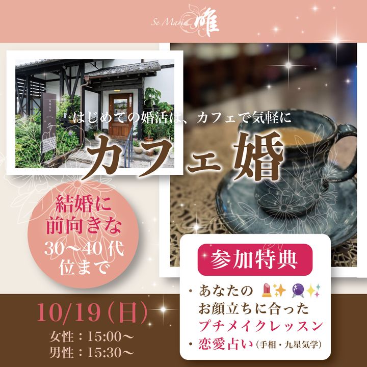 男性急募❣️10/19(日)15:30〜初めての婚活でも、安心して楽しめる出会いを。プチメイクレッスン💄と占い(手相・九星気学)🔮も楽しめる、カフェで気軽に話せる婚活イベントを開催します✨参加費 男性3000円 女性1000円ワンドリンク付き