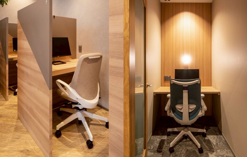 オンラインミーティングにも対応できる完全個室タイプの座席です。完全個室であるため大事な商談内容が他に漏れる事もありません。さらには15分単位の完全予約制であるため、大事な会議にも安心してご利用いただけます。また国内一流オフィス家具メーカーワークのワークチェアを完備していますので長時間の利用でも疲れにくい仕様となっています。その他、ヘッドセット、オンラインミーティングに適した照明を完備しております。※PC本体は設置しておりませんので、ご持参ください。(完全個室タイプは、別途、完全個室料金が必要です)