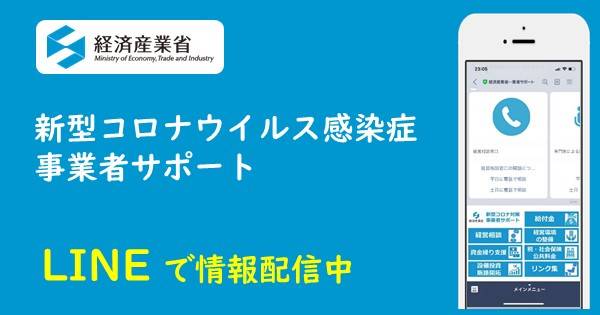 「経済産業省 新型コロナ 事業者サポート」公式LINEアカウント https://lin.ee/86WbIGf ↑ 新型コロナウイルス感染症関連の事業者向け支援メニューをご紹介するサービスです。ぜひ、「友だち追加」してください。 ※シェアボタンでの拡散に協力をお願いします。