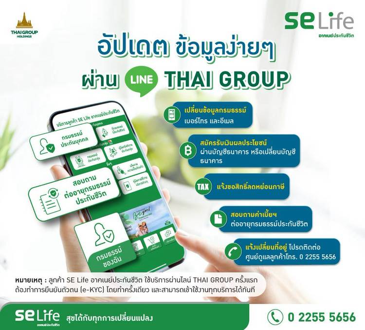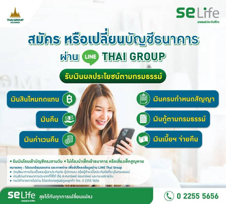 ลูกค้า SE Life อาคเนย์ประกันชีวิต สมัครหรือเปลี่ยนแปลงบัญชีธนาคารทำเองได้ ไม่ต้องออกไปเจอรถติด ง่ายๆ ผ่านไลน์ THAI GROUP . เมื่อสมัครรับเงินผลประโยชน์ หรือเปลี่ยนแปลงบัญชีธนาคาร สามารถรับเงินผลประโยชน...