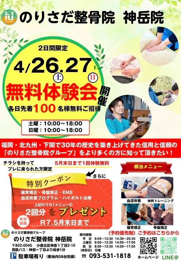 こんにちは!今週末は戸畑区にある「のりさだ整骨院本院」で2日間の感謝祭があります♪3月29日(土) 14:00-18:00,3月30日(日) 10:00-18:00上記の日時で日頃の感謝を込めて、無料の施術体験会を行います!!症状がなくても身体のチェックでOK!お気軽にお越しください!身体の悩みがある方はぜひお越しください!どんなことでもご相談ください!!