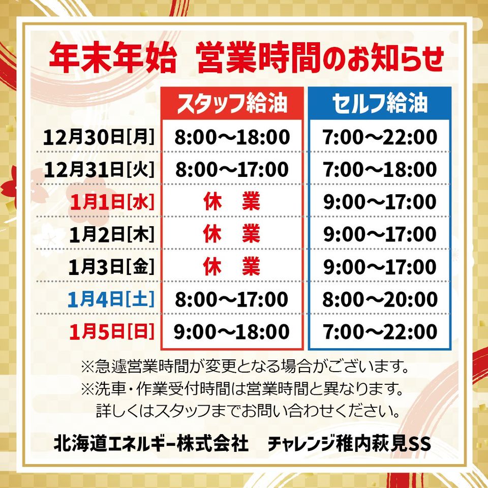 こんにちは!北海道エネルギー 稚内萩見SSです! 確かな知識と技術を持ったプロの手による総合的なサポートや情報提供を通して、一人でも多くのお客様が「安心で快適なカーライフ」を送って頂く為のお手伝いをさせて頂きます!お車のことでお困りの際には、お気軽にスタッフまでお声掛けください。皆様のご来店をスタッフ一同心よりお待ちしております!