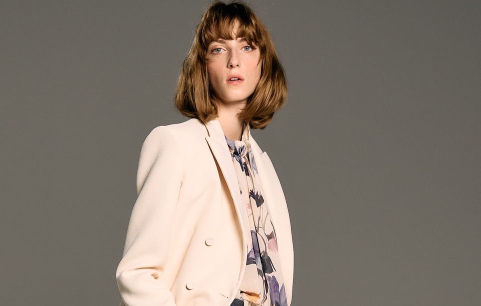 ¥80,300コットンオーガンジー ジャケットコットン100%のオーガンジーのようなシャリ感のある清涼感ある生地を使用した、夏におすすめのデザインジャケット。 身頃は二重仕立てで、袖は一重で透け感があり、さわやかな夏らしいジャケットです。 身頃は端正なVネックですが、袖にフリルが施され、品の良いデザインジャケット。 暑い夏の中、ジャケットを着なくてはいけない時にも、肩を隠し、袖は程よくシースルーで清涼感を与えてくれます。