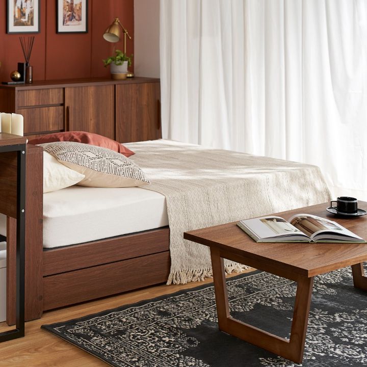 クロスやインテリアを流行色のブラウンでまとめて統一感を持たせた、ヨーロピアンヴィンテージ感漂うベッドルーム兼書斎。壁づけで配置をするのがオーソドックスのデスクを、ベッドと背中合わせにすレイアウトする新提案です。ベーシックなレイアウトではなく飛び道具的コーディネートは、お部屋のムードを一新できます。