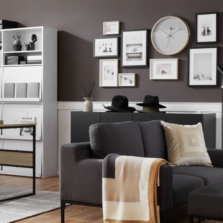 ソリッドなデザインデスクをメインに据えた書斎スペース。王道のブラック×ホワイトのモノトーンをベースにグレーのアクセントクロスやインテリア、その他のアイテムで濃ゆ過ぎるモノトーンを和らげるように色調を。ナチュラルカラーのアイテムを差せば、シックでかっこ良く、その上、優しい印象の空間を演出できます。