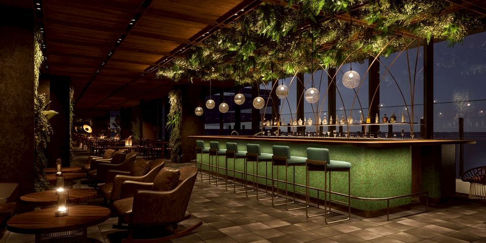 ジャングルを思わせる深い緑と眺望が広がる、最上階のルーフトップバー。