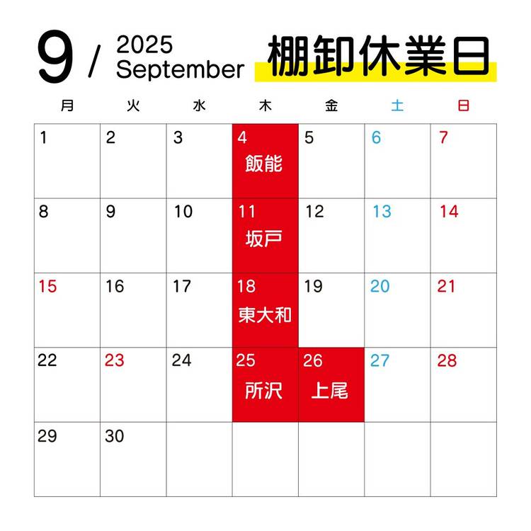 日頃より、ぶんぐまるをご利用いただき誠にありがとうございます。 棚卸の為終日休業日がございますので、ご案内申し上げます。 ・飯能店 9月4日(木) ・坂戸店 9月11日(木) ・東大和店 9月18日(木) ・所沢店 9月25日(木) ・上尾店 9月26日(金) お客様にはご不便おかけいたしますが、ご了承の程お願いいたします。
