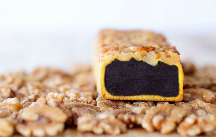 定番の豆沙餡(黒餡)を、しっとりとした皮で包み、 表面には香ばしくローストしたクルミをたっぷりトッピング。皮と餡のしっとりとした食感とクルミの香ばしい食感が楽しめるお菓子に焼き上げました。
