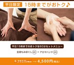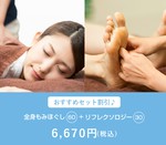 肩コリや背中の痛みだけではなく、足の冷えやむくみも気になる方には、もみほぐしとリフレがセットになったお得なコースがオススメ。 疲れた自分にいつもより少し贅沢なご褒美を♪ 料金:6,670円(税込)