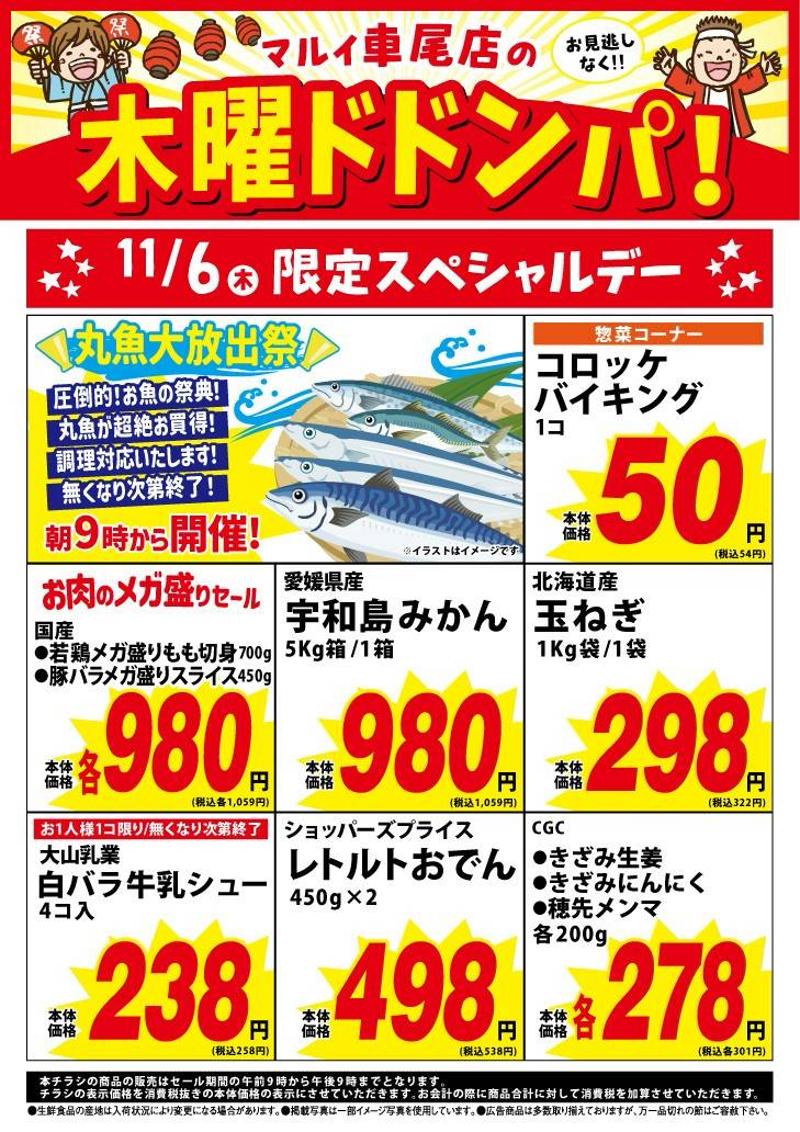 (tulip)木曜日の車尾店は超絶お買得(tulip) 今週もやってまいりました(sparkle) (wave)丸魚大放出祭(wave) 圧倒的な魚市場感(moon shocked)(!!!) AM9時よりスタートです(Cony hope) もちろん調理対応いたします(good) 午前中で終了予定ですので どしどしご来店ください(big smile)