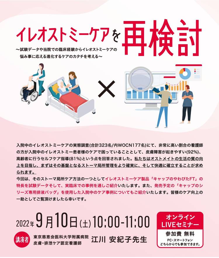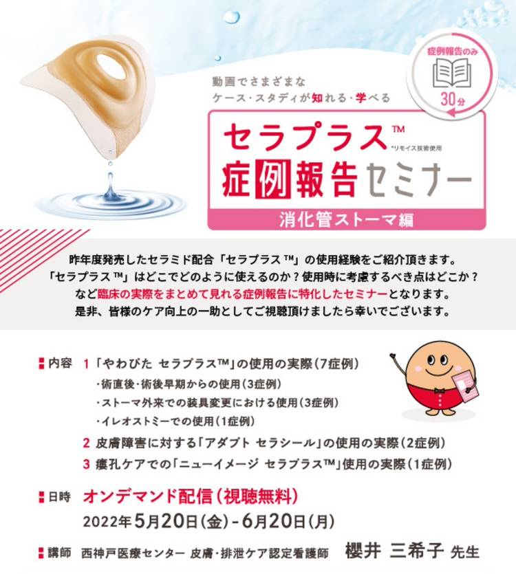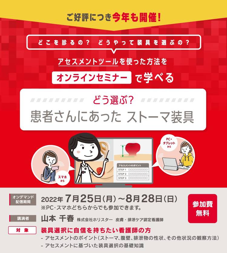 こんばんは😊 本日は現在配信中のオンラインセミナーのご紹介です💁 現在、「がん治療中のストーマ保有者への意思決定の支援~ストーマ外来看護師としてできること~」を8月14日まで配信中です。 本セミナーでは、横浜市立大学附属市民総合センターの宮田晶代先生にストーマ造設患者にとってのストーマの意味の捉えなおしの必要性と 高齢により意思表明が困難になったストーマ保有者に対する地域資源を活用した意思決...