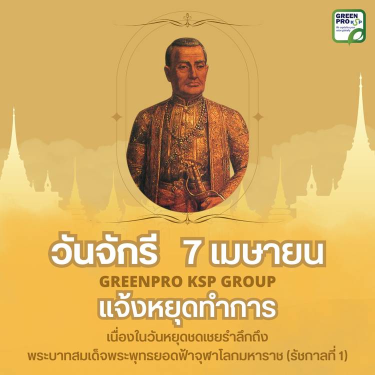 ✨ เนื่องในวันจักรี ขอเชิญชวนทุกท่านร่วมกันรำลึกถึง พระบาทสมเด็จพระพุทธยอดฟ้าจุฬาโลกมหาราช พระมหากษัตริย์ไทยรัชกาลที่ 1 ในราชวงศ์จักรี🙏 💚Greenpro KSP Group 📢 ประกาศวันหยุดทำการ วันจันทร์ที่ 7 เมษาย...