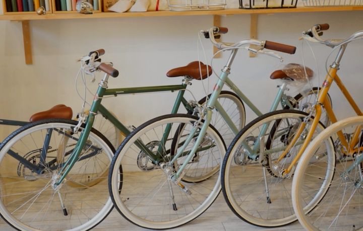 当店では、男性だけでなく女性も入りやすいカフェのような雰囲気のするお店で白を基調とした店内にはおよそ50台の自転車を展示しています。