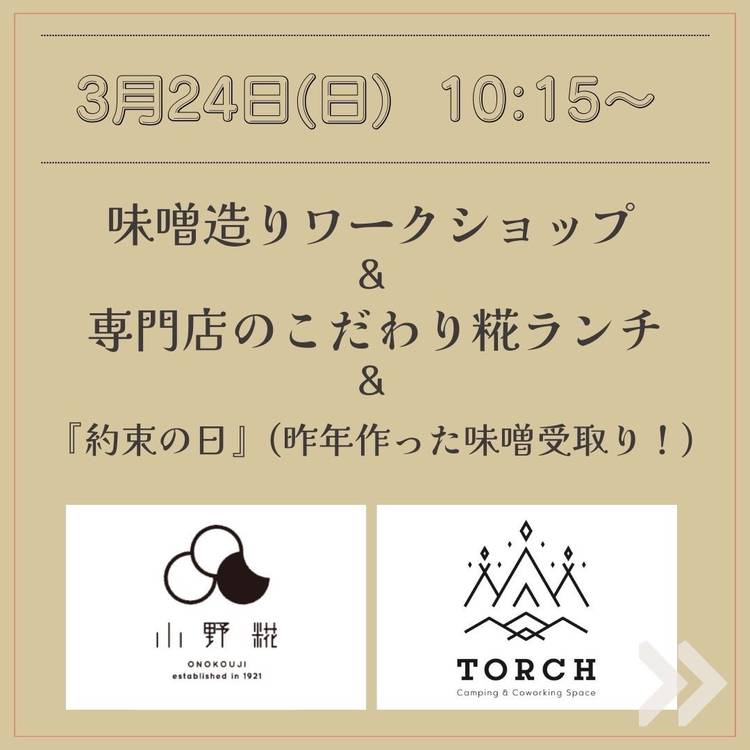 【TORCHイベント】お味噌作りワークショップ + 糀ランチ + 約束の日(昨年のお店のお渡し) 今年の小野糀さんとのコラボイベント、お味噌作りワークショップの日程が決まりました! そして昨年TORCHにてお味噌を仕込んで頂いたお客様お待たせしました!いよいよ出来上がりです!約束の日は覚えていますか?大切なお味噌を迎えに行く時が来ました。 そして昨年同様、糀ランチもご提供します。 そ...
