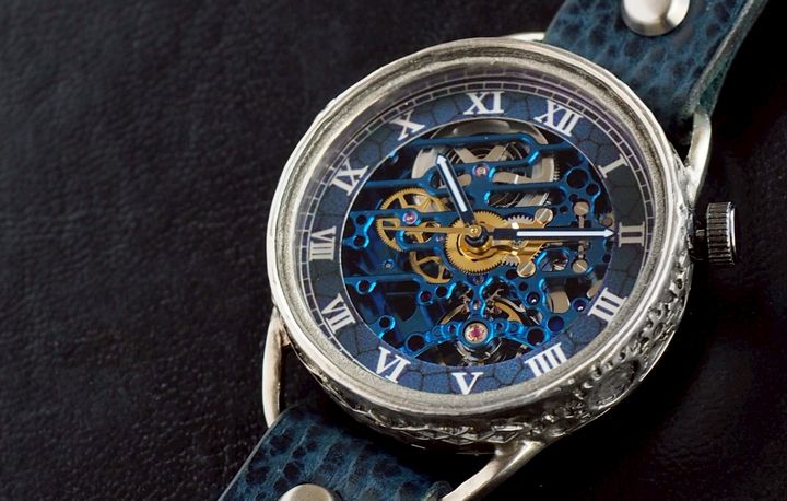 手作り腕時計 自動巻き 裏スケルトン メカニックブルー