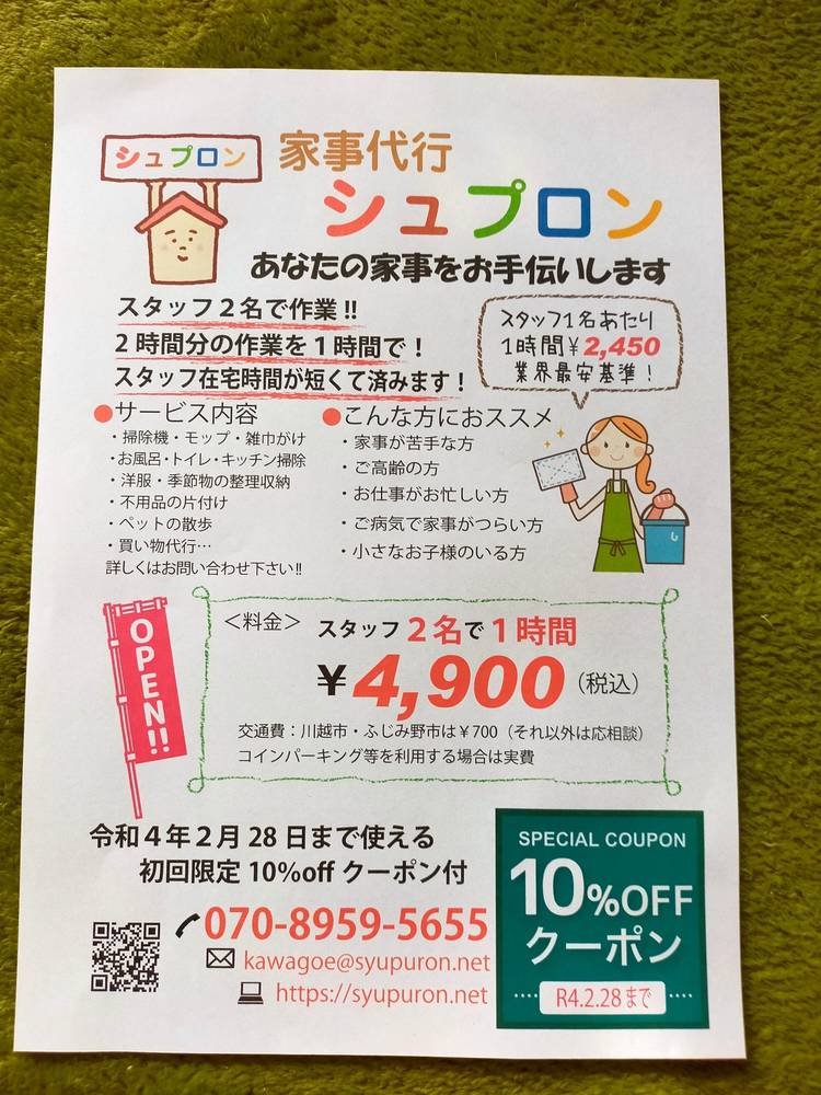 家事代行シュプロン、オープンします! 忙しい毎日を送っているみなさま、シュプロンがその家事をお手伝いします。 掃除・洗濯からペットの散歩まで。お気軽にお問い合わせください! #家事代行#家事#川越#ペット#ふじみ野#所沢#狭山#断捨離#整理収納#大掃除