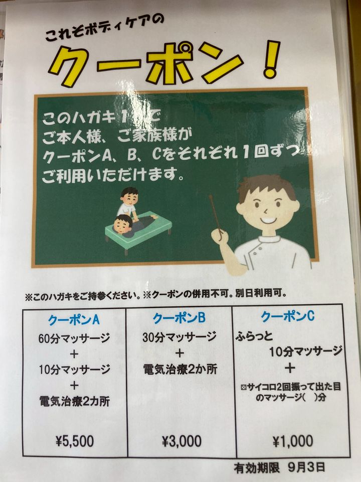 8月も折り返し! 現在のクーポンの期限が9/3(土)までです! まだご利用でない方、ぜひこの機会に♪ ボディケア整骨院 0546395777