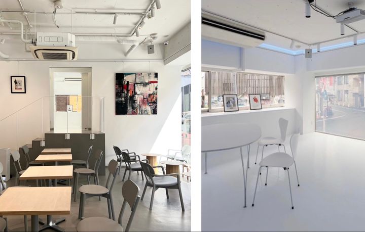 テーブル、椅子、wifi完備、さらに壁面にはピクチャーレールも配置され、展示会、ポップアップ、ワークショップなど様々なイベントにご利用いただいています😊