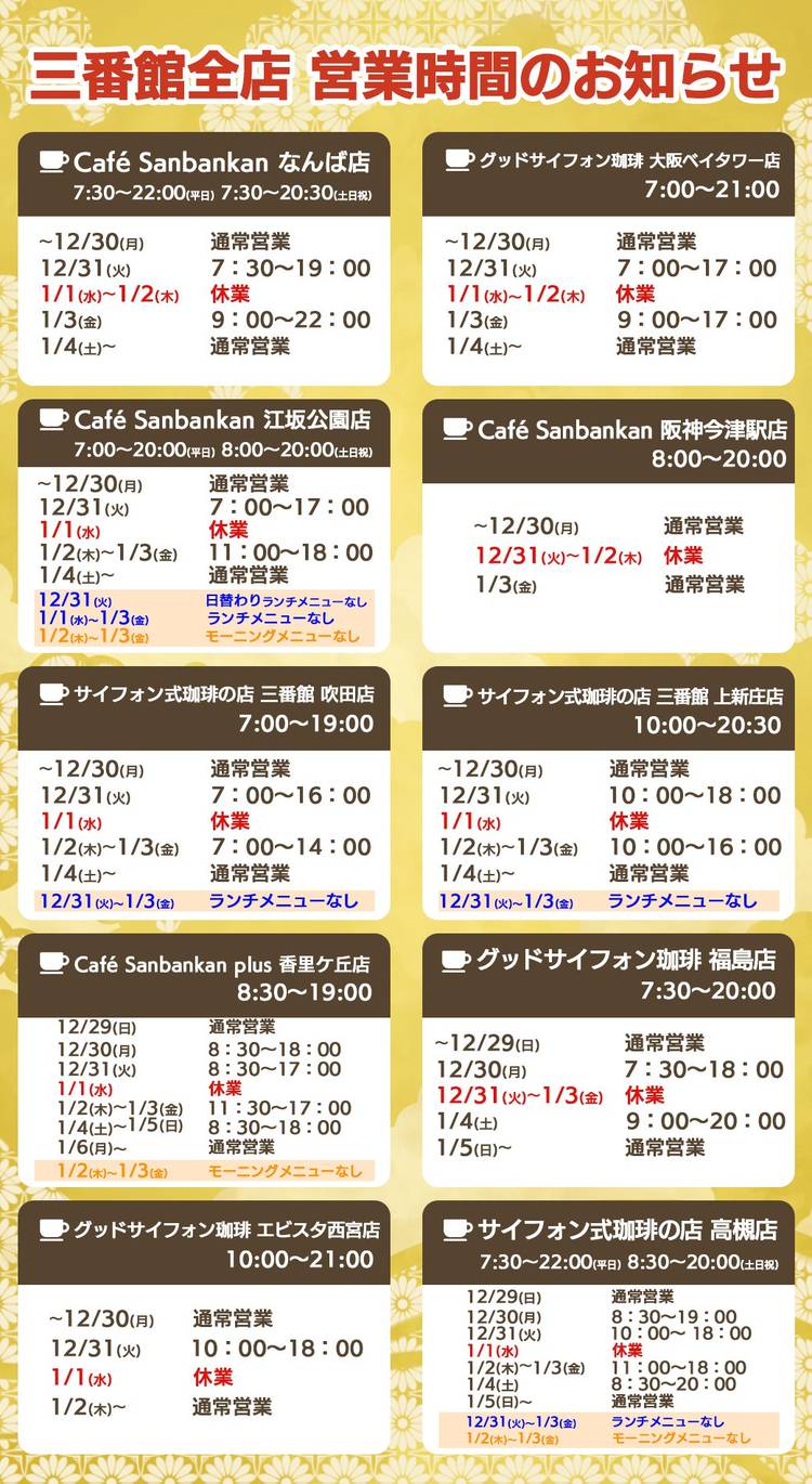 ・。*・。*・。*・。*・。*・。* 🎍営業時間のお知らせ🎍 ============ 本年もたくさんのご愛顧を賜り ありがとうございました🙇♀️ 来年も皆様の三番目の場所を 目指して、おいしい珈琲と 心地のよいサービスのさらなる 向上に努めてまいります☕ 来年も皆様にとって、 笑顔溢れる1年となりますよう 良いお年をお迎え下さい😊✨ ・。*・。*・。*・。*・。*・。*
