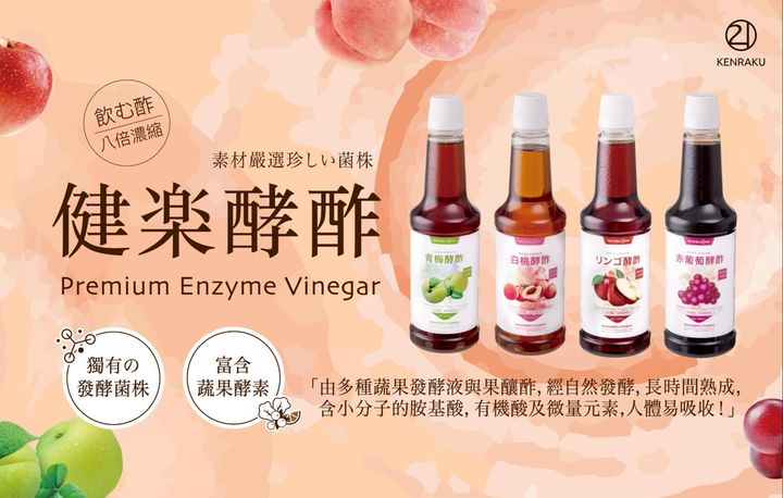 AKenraku21健樂酵酢是『酵素+好醋』,由多種植物蔬果酵素、果釀醋以及陳年穀物醋,經長時間釀造熟成,產品含豐富胺基酸、有機酸及微量元素。八倍濃縮純度高,可稀釋調配出各種健康飲品或料理,酸甜口感、入口滑順柔和,無一般果醋的嗆味,小分子營養價值高。