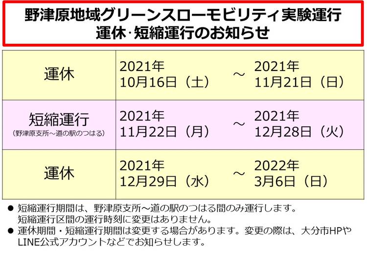 【大南運休情報(予告)】 大南地域のグリーンスローモビリティは準備のため 4月3日(月)~7日(金)は終日運休します。 4月10日(月)より運行ルートを変えて再開します。 (新しいルートやダイヤ等は大分市ホームページからご確認いただけます。) なお、野津原・佐賀関のグリーンスローモビリティは4月3日より運行予定です。