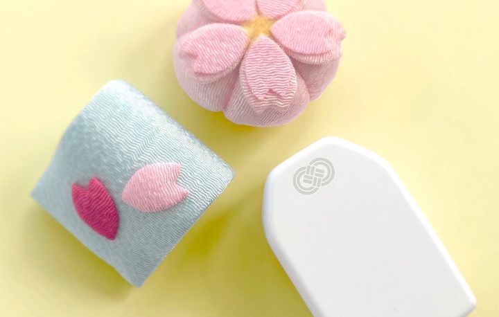 わたしらしさを添えるomamolinkケース。 可愛らしい柄布を用い 水引のゴムで留めた まるで和小物のよう。