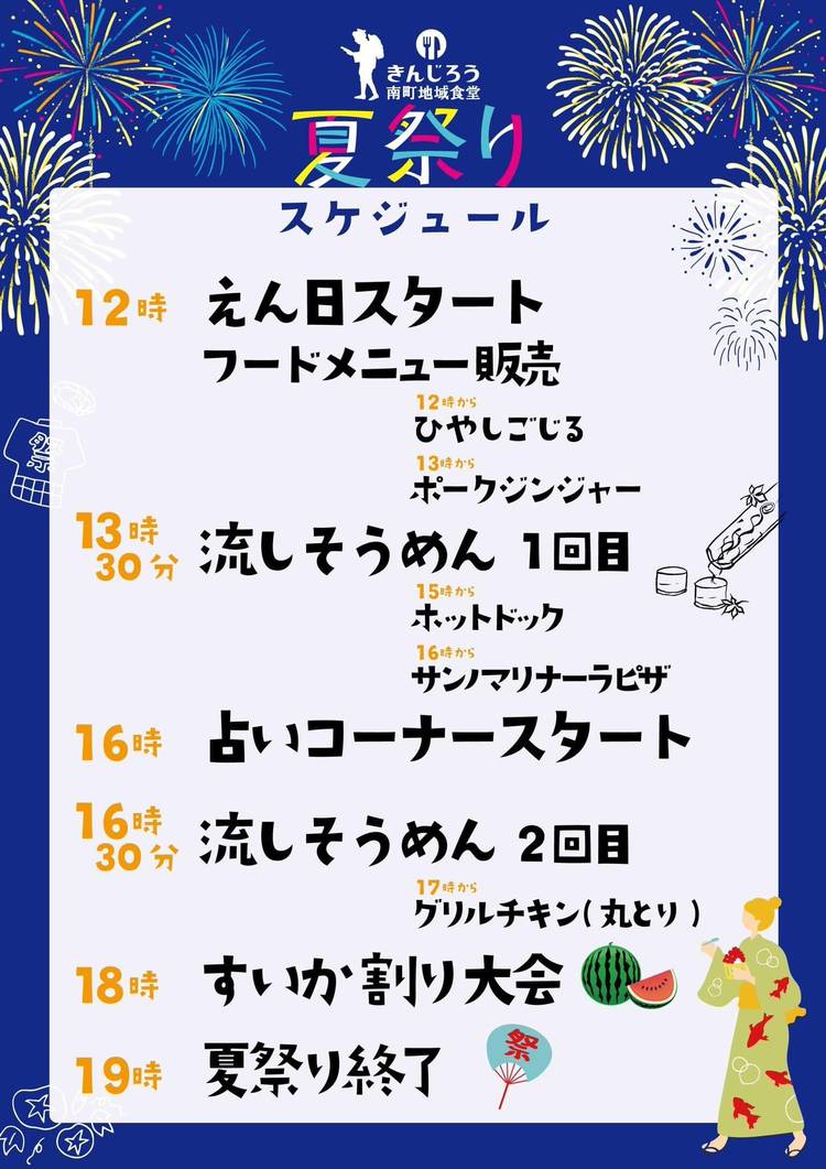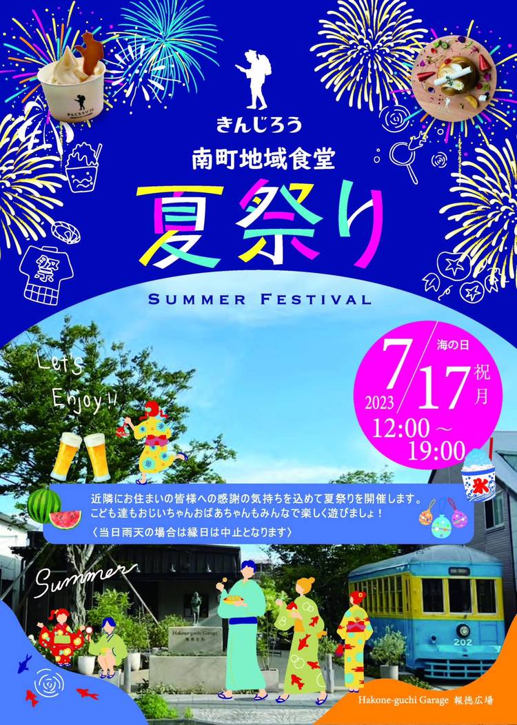 本日7/17(月祝)12:00-19:00開催! きんじろう南町地域食堂夏祭りのタイムスケジュールと縁日詳細はこちら。 皆様のご来店お待ちしております! #夏祭り #縁日 #箱根口ガレージ #パティスリーヒンナ #きんじろう南町地域食堂 #地域交流