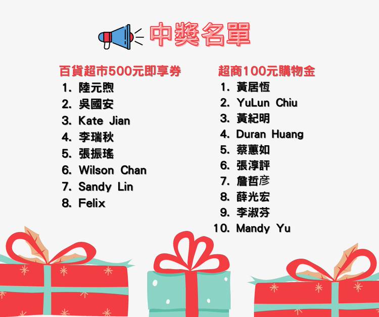 友空間【後疫時代遠距辦公解方】直播活動中獎名單出爐啦~ 感謝大家對活動熱烈的支持~~ 🙂恭喜幸運得主🙂 *溫馨提醒: 1.獎項均為電子禮券,已依中獎者報名活動時留填之Email寄發完畢,請於Email內通知期限內領取,逾期恕不補發。 2.本活動如有未盡事宜,台灣用友擁有保留、修改、暫停及解釋活動內容之權利。