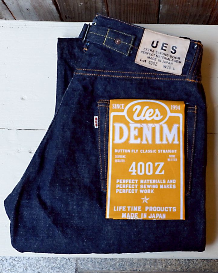 UESでは初めての限定デニムパンツ「限定400-Z クラシックデニム 」を直営店限定で発売中です!定番の400-Zを特別仕様にアレンジした「限定400-Z」その名の通り完全限定生産となります。フラッシャー手ぬぐい付き。UESオリジナルの14.9ozの生地でワイドなシルエットのため、どなたでも穿きやすい1本です。ボタンや革パッチなど、細部に限定ならではのポイントが潜んでいます。
