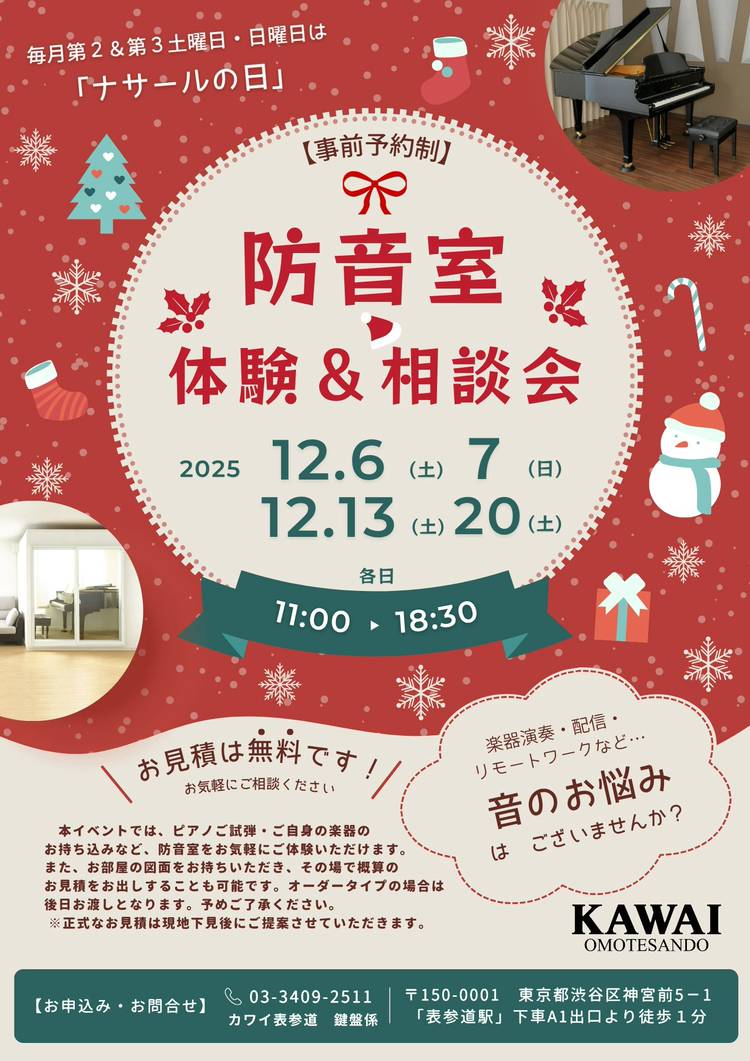 毎月第2&3土曜日・日曜日は 🍁『ナサールの日』🍁 11月の防音室体験&相談会のご案内 ※11月は下記日程にて開催いたします。 <防音室体験&相談会> ・11/22(土)11:00~18:30 ・11/29(土)30(日)11:00~18:30 ※事前ご予約制 ※レンタルスタジオとして使用されている防音室が一部ございます。 簡単組立・移設が可能な『ユニットタイプ』、自由設計の『オーダータ...