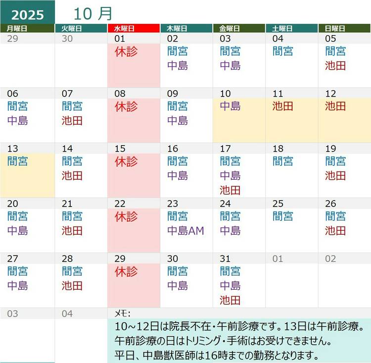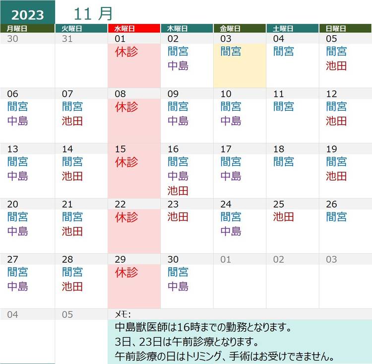 11月の獣医師出勤表になります★ 20日は院長不在・午前診療となりますので ご注意ください。