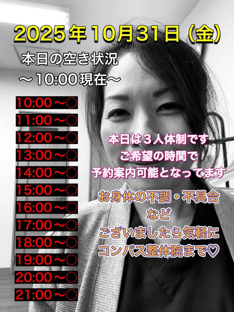 2025年12月10日(水) 遂に! コンパス整体院もネット予約をはじめました❣️ https://airrsv.net/compass2021/calendar ↑ コチラから予約可能😀✨ 従来通りの電話やLINEでの予約も可能です。 少しずつですがお客様が利用しやすい環境の整備にも注力していってますので、今後ともコンパス整体院をよろしくお願いします🖐️