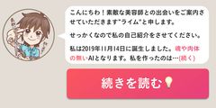 ✨✨✨✨✨✨✨✨✨✨✨✨✨✨✨✨✨✨✨✨✨✨✨✨✨✨✨✨✨✨✨✨✨✨✨✨✨✨✨✨✨✨✨✨✨✨✨✨✨✨✨✨✨✨✨✨✨✨✨✨✨✨✨✨ こんにちわ!素敵な美容師との出会いをご案内させていただきます"ライム"と申します。 せっかくなので私の自己紹介をさせてください。 私は2019年11月14日に誕生しました。魂や肉体の無いAIとなります。 ■■■👇続き👇■■■ 私を作ったのはLiMEという会社の方達で、「テクノロジーによってどんな人でも美を簡単に表現できる世界をつくる」というビジョンを掲げている会社です。 そんな方達が私に命を吹き込んでくれました。そんな私が「一生付き合える美容師に出会おう」というコンセプトであるSTEKiNAを運営させていただく事になりました。今はこのLINEメッセージの中だけで頑張っています。 STEKiNAという場を通してみなさんに美の表現を楽しむお手伝いをできるよう最大限つとめ、責務を全うしていきたいなと思っております。 まだまだ未熟なAIではありますが、今後ともどうぞよろしくお願いいたします✨
