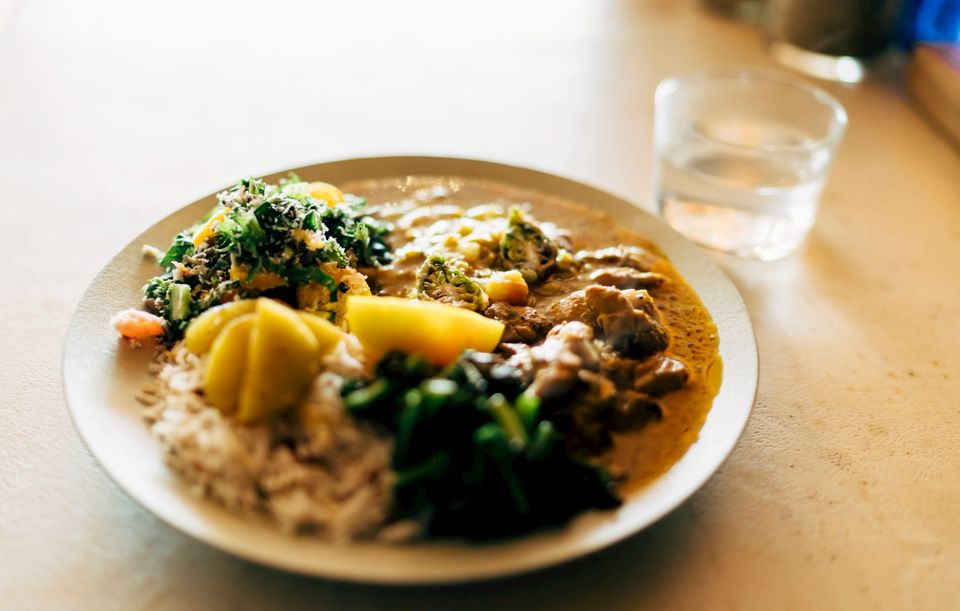 平飼いの鶏肉などを作ったチキンカレーをメインに、たっぷりのスパイスお惣菜を添えたお弁当。※チキン以外を使用する日もあります。