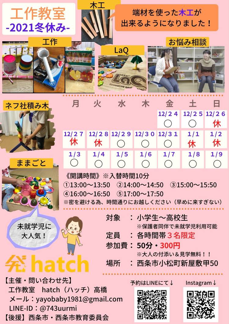 こんにちは! 発-hatch-です。 新学期が始まって1週間、いかがでしたか…?? 新しい教室、新しい先生、新しいお友達。 ワクワクする事もあるケド 緊張したり、戸惑ったりした事もあるかもしれませんね! 1週間頑張ったご褒美に 好きな事を楽しんでみませんか…?? 明日(4/16)、 aでんきさんのスペースをお借りして 工作イベントを実施します! 今回の内容は【アクセサリー作り】 興味のある...