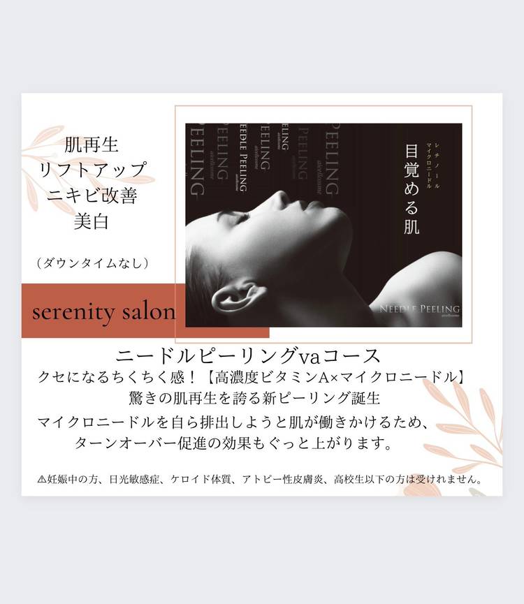 こんばんは♡ serenity salonの河原崎です☺️✨ だんだん暖かくもなり、過ごしやすくなってきましたね🌸 季節の変わり目で、肌荒れしやすい時期ですが皆様大丈夫でしょうか😭 お顔は保湿と紫外線対策を入念にしないとですね‼️ 新しいコースのご紹介です☺️ ✨ニードルピーリングvaコース✨ クセになるちくちく感♡ 『高濃度ビタミンA×マイクロニードル』 驚きの肌再生を誇る新ピーリング誕...