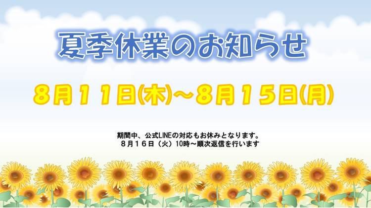 《🎍年末年始休業のご案内🎍》 2023.12.28(木)~2024.1.4(木) ※公式LINE対応につきましては、2024.1.5(金)10:00より順次返信いたします。 期間中大変ご不便をおかけいたしますが何卒よろしくお願いいたします。