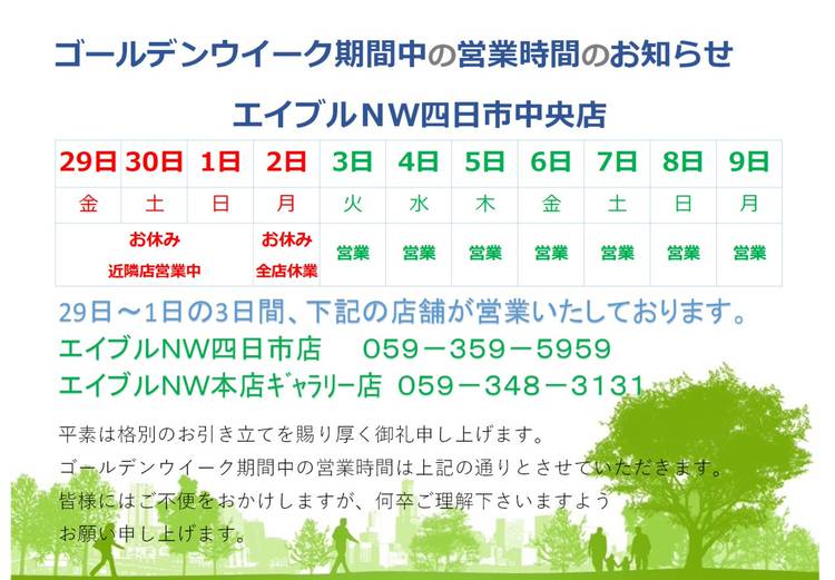 【ゴールデンウィーク休業のご案内】 平素は格別のご高配を賜り厚く御礼申し上げます。 エイブルNW四日市中央店でございます。 当店では、誠に勝手ながら、下記の期間をゴールデンウィークの為、休業とさせていただきます。休業期間中、お客様には大変ご迷惑をお掛けいたしますが、何卒ご理解賜りますようよろしくお願い申しあげます。 【休業期間】 4月29日(金)~5月2日(月) 5月3日(水)9時30分より...