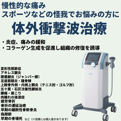 体外衝撃波治療とは、低出力の衝撃波を皮膚の上から照射することで、痛みのある箇所の神経を変性させたり、血管の再生を促すことで痛みを和らげたり、痛みを取り除く治療です。元々は腎臓結石や尿路結石のような体内にできた結石を破砕する治療法として用いられてきましたが、近年は整形外科領域にも応用されるようになり、海外では足底腱膜炎やテニス肘、ゴルフ肘などの様々な疾患の治療に用いられています。 体外衝撃波疼痛治療装置には発生原理や波形によって、集束型と拡散型の2種類があります。集束型の治療装置は、集束した範囲にエネルギーを与えるので、局所的な治療が可能です。患部のみに高いエネルギーを与えることができるため、腱付着部炎、偽関節、疲労骨折、離断性骨軟骨炎、石灰沈着性腱板炎のほか患部が体内の深くにある疾患などにも有効です。 当院では厚生労働省より事業承認を受けている、BTL社の「集束型衝撃波BTL-6000 フォーカス®」という装置を導入して治療を行っています。