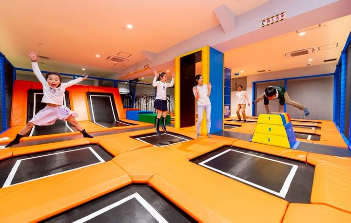 アスレチックとトランポリンが融合!トランポリンを使って様々な遊びが楽しめる!トランポリンを使ってエアバックにダイブなどスリル満点!