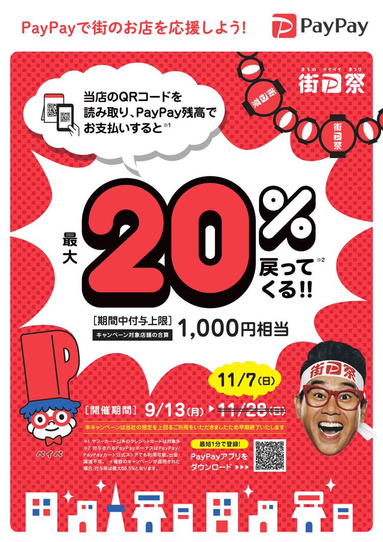 当店でもお得なPayPayクーポンを本日より実施しております。 期間は2021年11月28日までです。 PayPayボーナスが決済金額の20%、1回あたりの最大付与額は2,000円までとなっており、合計付与上限額も2,000円となっております。 精肉コーナーと焼き鳥コーナーはそれぞれ別のクーポンとなっておりますので、合計最大付与額4,000円がPayPayボーナスとして戻ってきます お得にお...