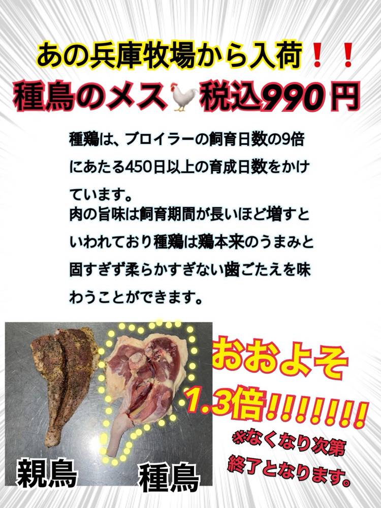お世話になります😃🌇🐔🐣☀️💓🎵 パチャマンカ藤田店ですʚ( •௰• ໒꒱· ゚ 近頃暖かくなってきて気持ちがいいですね! 藤田店では大人気商品の 種鶏の販売が始まります!! 明日には店頭で販売している可能性大です‼️ 蔓延防止も7日から解除されたので ぜひお酒とご一緒に食べてみてください🐓