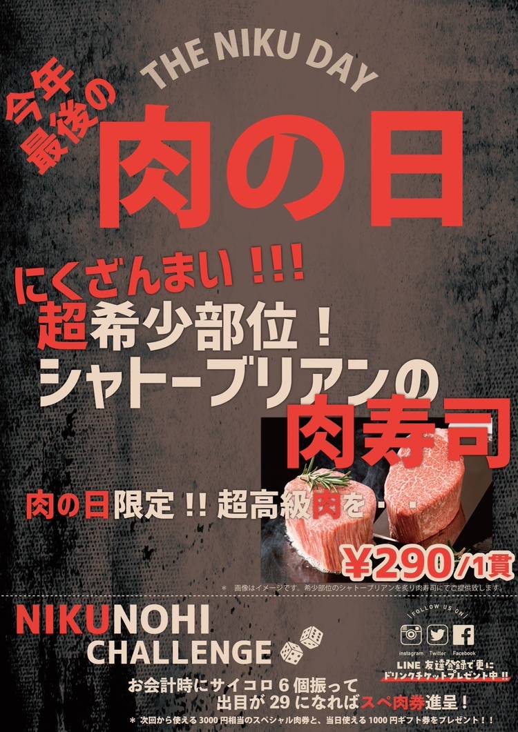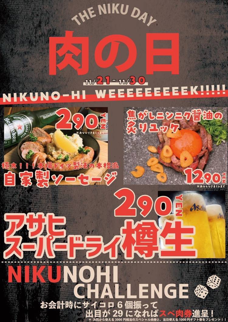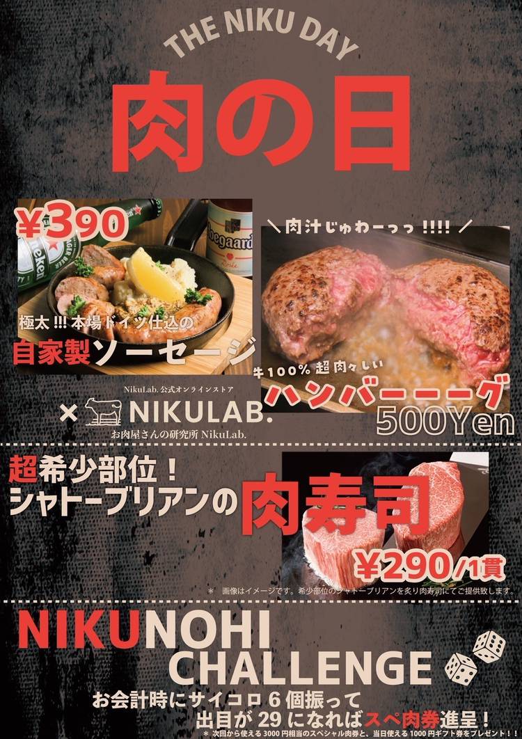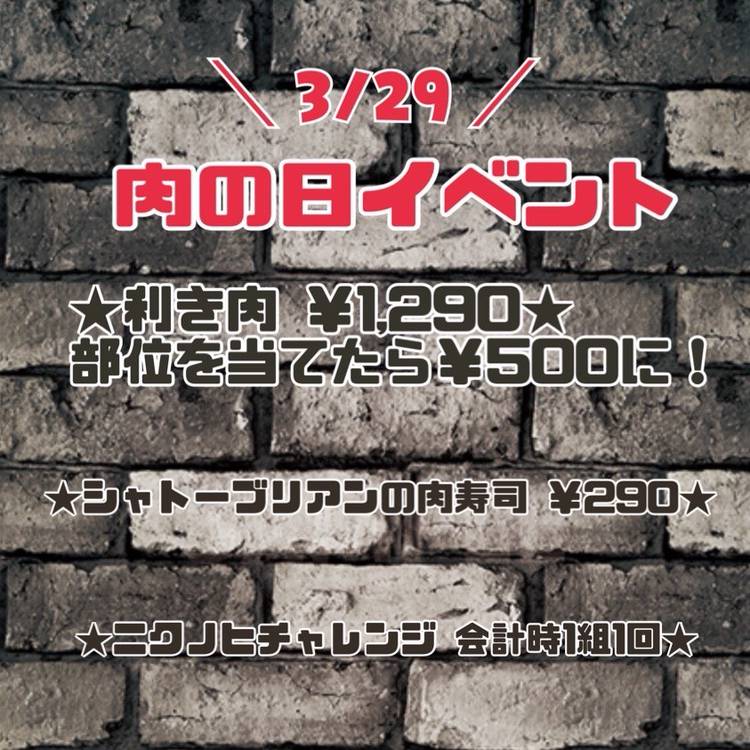 【イイ肉の日イベント】 年に一度のイイ肉の日が迫ってきました🐄💟🥩 1 1 2 9 イ イ ニ ク ...♡ menuは、、 _________________ 本場ドイツ仕込み🇩🇪 極太自家製ソーセージのグリル 390円 肉肉しい牛100%🐂 牛ハンバーグ 500円 超レア肉 幻の...🥩✨ シャトーブリアン肉寿司 290円 お会計時の運...